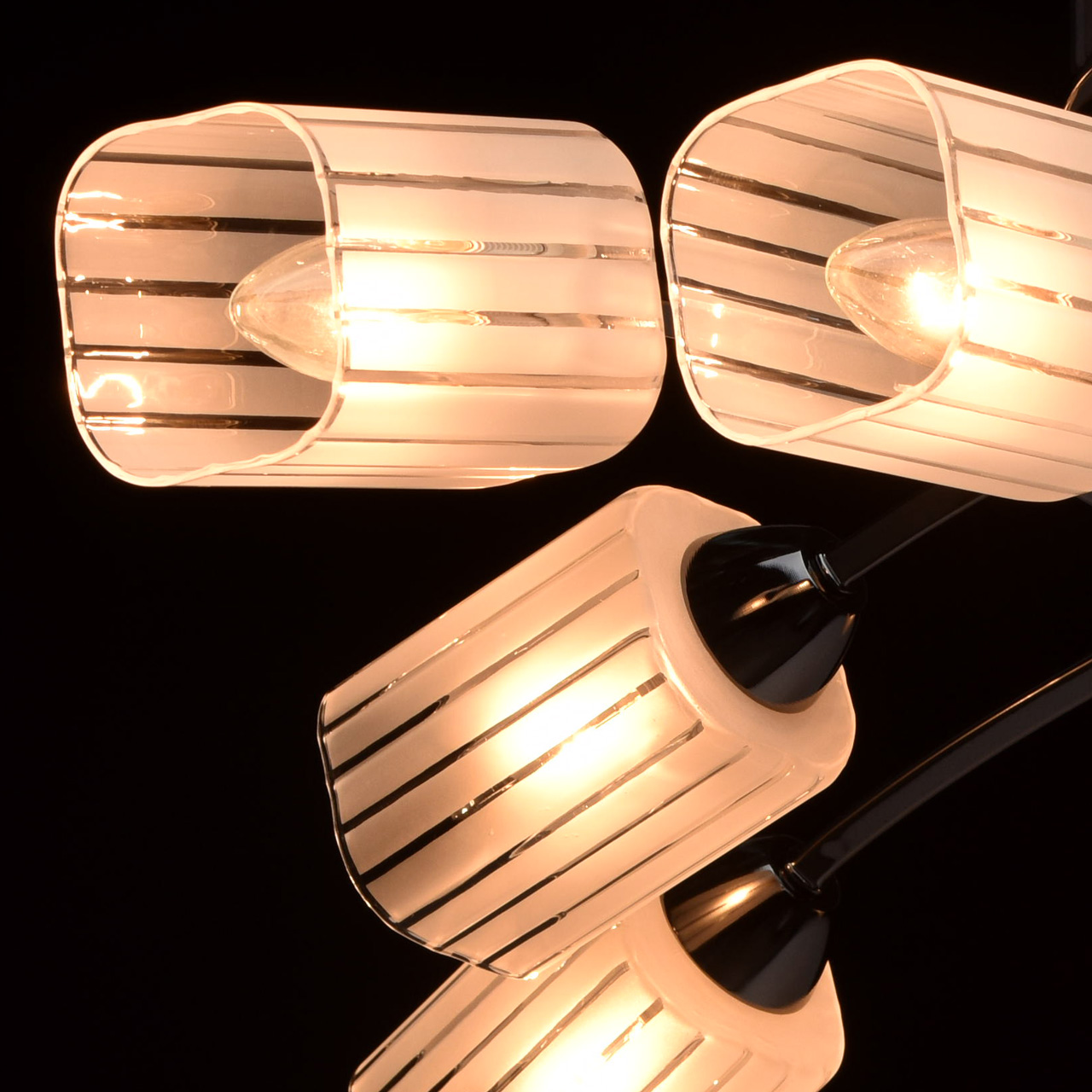 Основание светильника выполнено из металла и гальванизировано в цвет черного никеля. Потолочная чаша и держатели плафонов изготовлены по технологии обработки на токарном станке.Плафоны: стекло, отлито в форму. Плафоны матированы по трафарету.