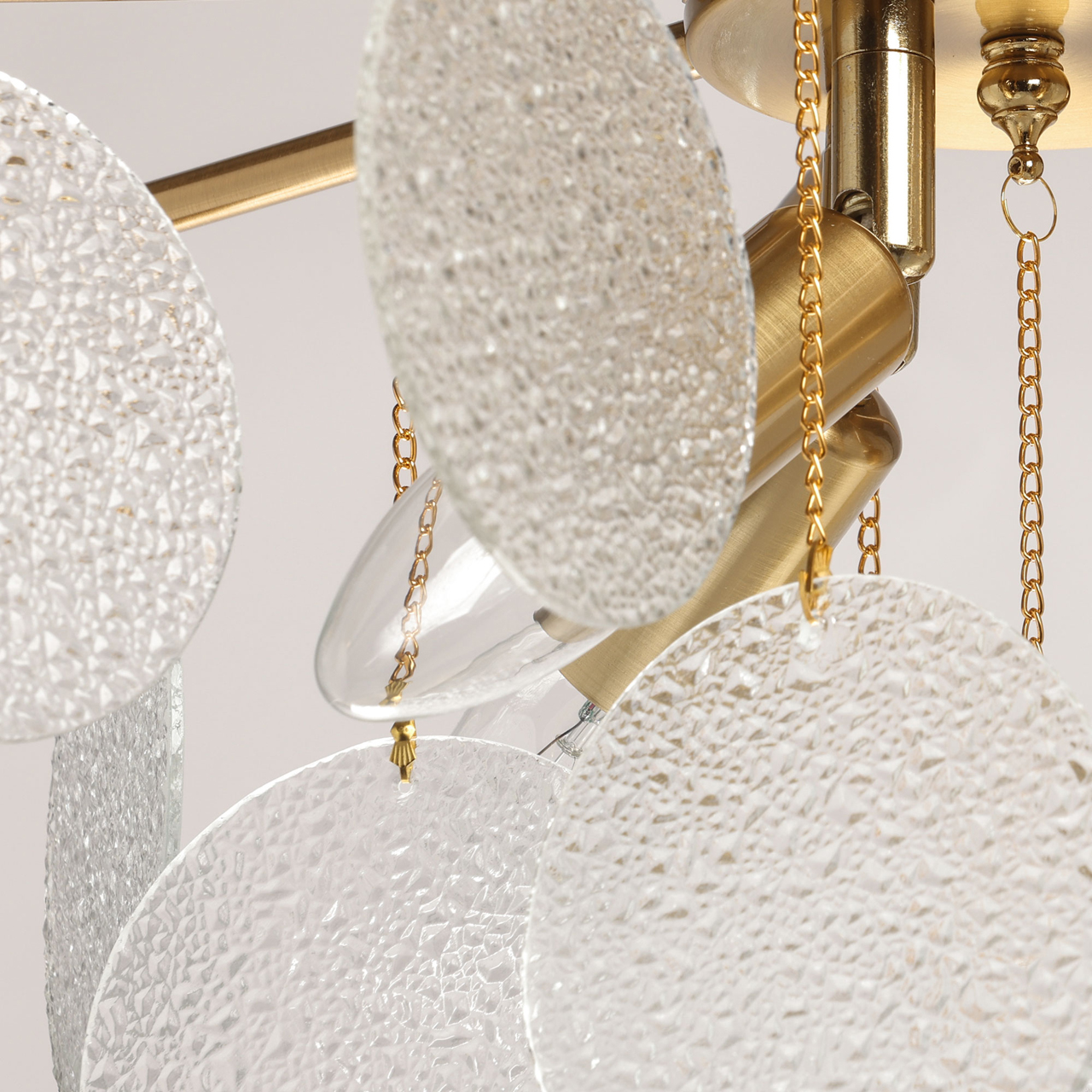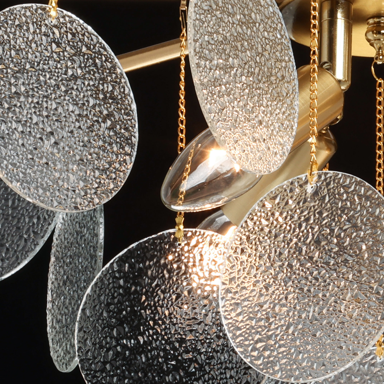 Металлическое основание подвесной люстры гальванизировано в цвет латуни. Люстра декорирована подвесками из фактурного полупрозрачного стекла.