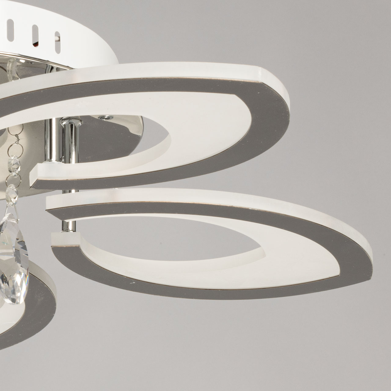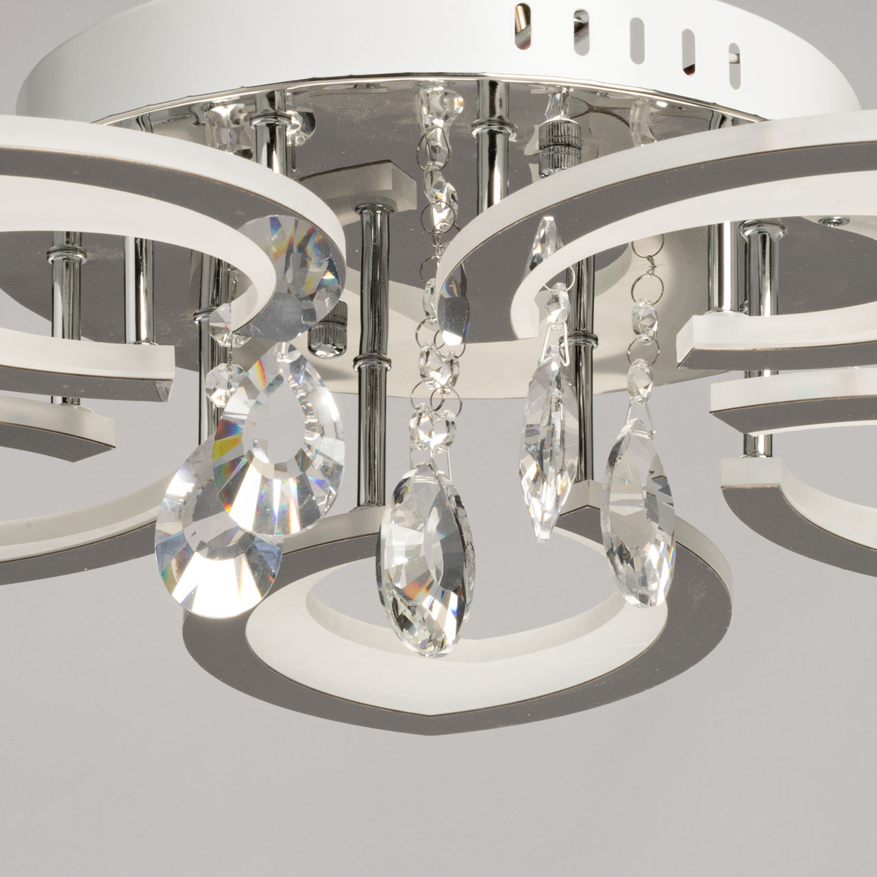 Металлическое основание потолочной люстры гальванизировано в цвет хрома. Светодиодные источники света закрыты белым акрилом. Люстра декорирована пластинами, гальванизированными в цвет хрома и подвесками из прозрачного хрусталя
