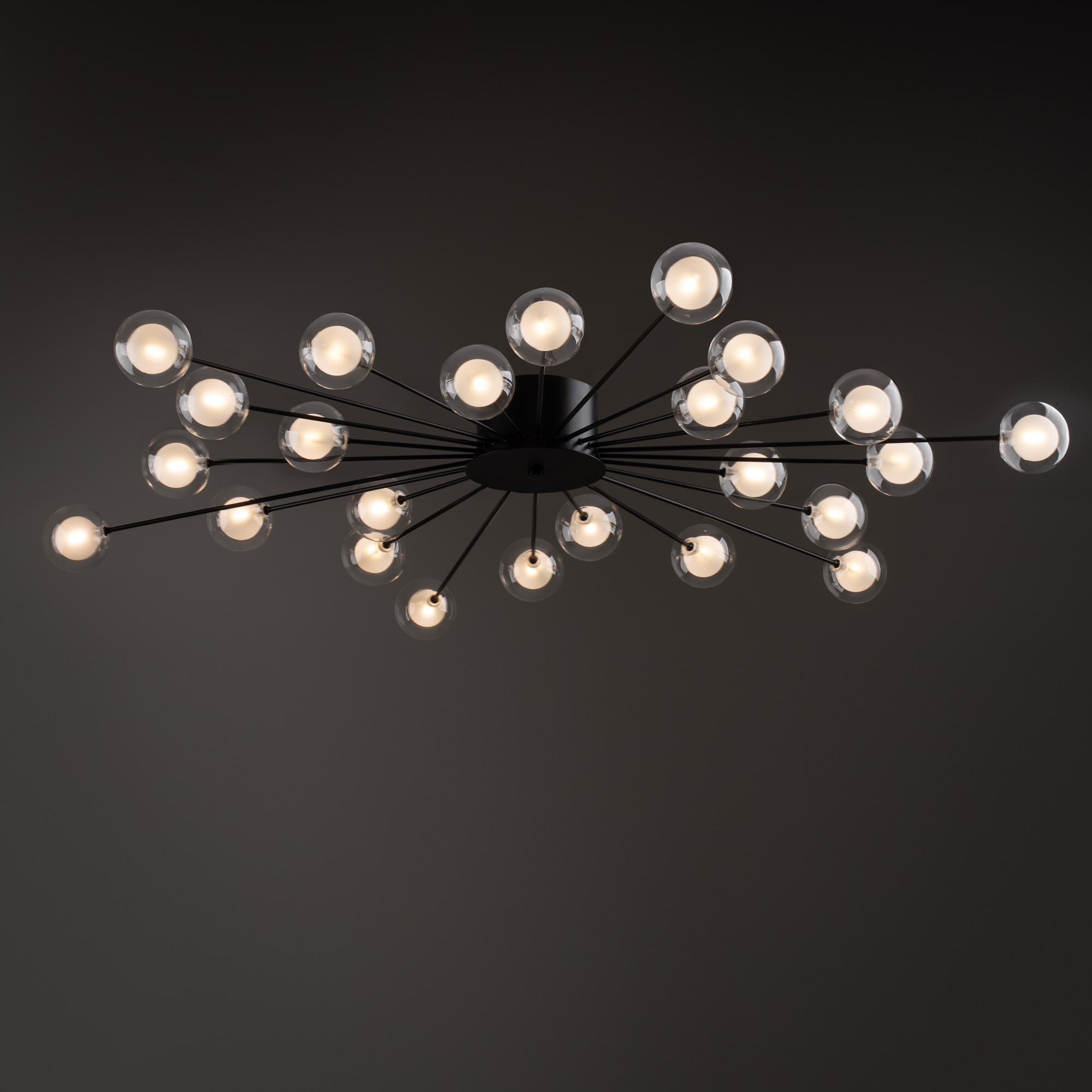 Celebrity ー это изобретательное произведение искусства. Источник света представлен двумя видами плафонов: двойное стекло и акриловое стекло в сочетании с латунной металлической окантовкой. Эти маленькие огоньки раскинуты по всей площади светильника и создают ощущение, что в вашей квартире есть свое небольшое звёздное небо. Плафоны расположены на концах арматур, которые по кругу выходят из цилиндра в центре. Материал плафонов: стекло, акрил. Цвета арматуры: черный и золото.