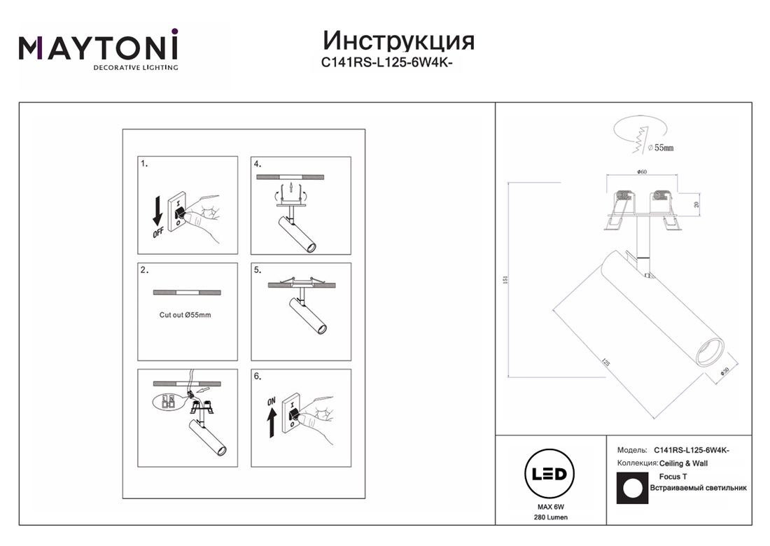 Спот поворотный Maytoni Focus T C141CL-L125-6W4K-B — это надёжный и долговечный осветительный прибор, который прослужит вам долгие годы, не теряя своей яркости и качества света. Производитель Maytoni дает гарантию на свои товары . Данную модель C141CL-L125-6W4K-B спешите купить в интернет-магазине 220svet.