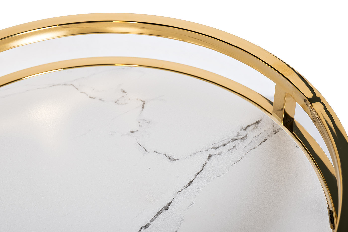 Дизайнерский журнальный столик со стеклом несет в себе большую декоративную нагрузку. В качестве столешницы выступает закаленное стекло с полимерным покрытием с эффектом «под мрамор». А основание из позолоченного металла делает круглый журнальный столик по-настоящему роскошным предметом обстановки. Конструкция выглядит визуально легкой и воздушной, но при этом она устойчивая и прочная благодаря металлическому каркасу. Журнальный золотой столик оригинального дизайна прекрасно впишется в современный интерьер в стиле ар-деко, неоклассика, контемпорари, минимализм. Толщина столешницы - 8мм, высота от пола 50см