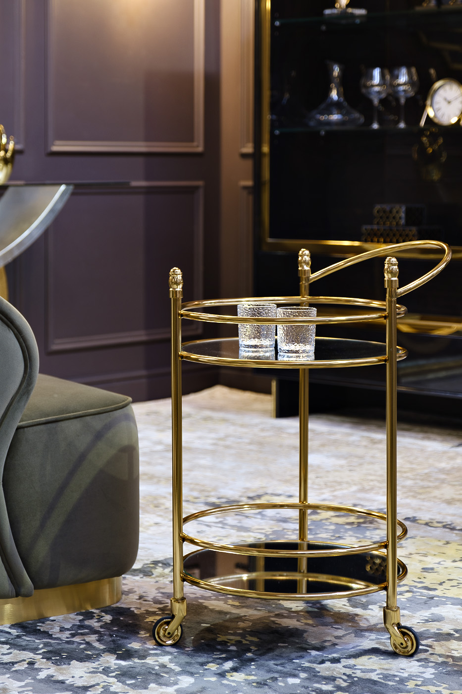 Сервировочная тележка с корпусом из нержавеющей стали и зеркальными полками станет изысканным дополнением к интерьеру. Ее можно использовать в качестве журнального столика или столика для подачи напитков и закусок. Ролики на ножках придают этой мебели мобильности и функциональности. Благодаря оригинальному дизайну этот стол-тележка на колесиках станет не только эффектным украшением пространства, но и отличным подарком тому, кто предпочитает интересные вещи в стиле ар-деко. Предлагаем купить 2х ярусную сервировочную тележку премиум класса для гостиных, холлов и лобби-зон, чтобы обеспечить комфортный прием гостей.