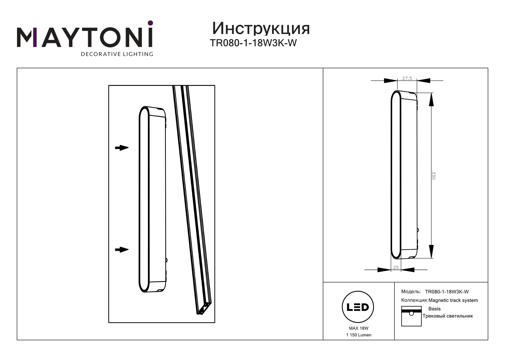Купить "Трековый магнитный светильник Technical Basis TR080-1-18W3K-W"