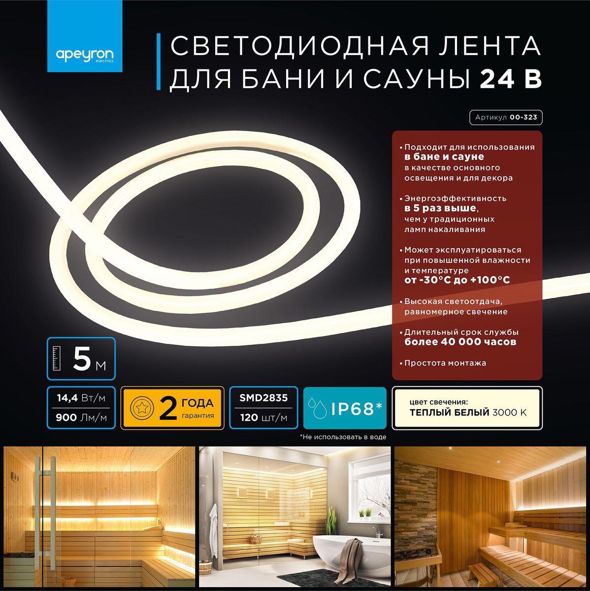 Купить "Влагозащищенная лента Apeyron 14,4W/m 120LED/m 2835SMD теплый белый 5M 00-323"