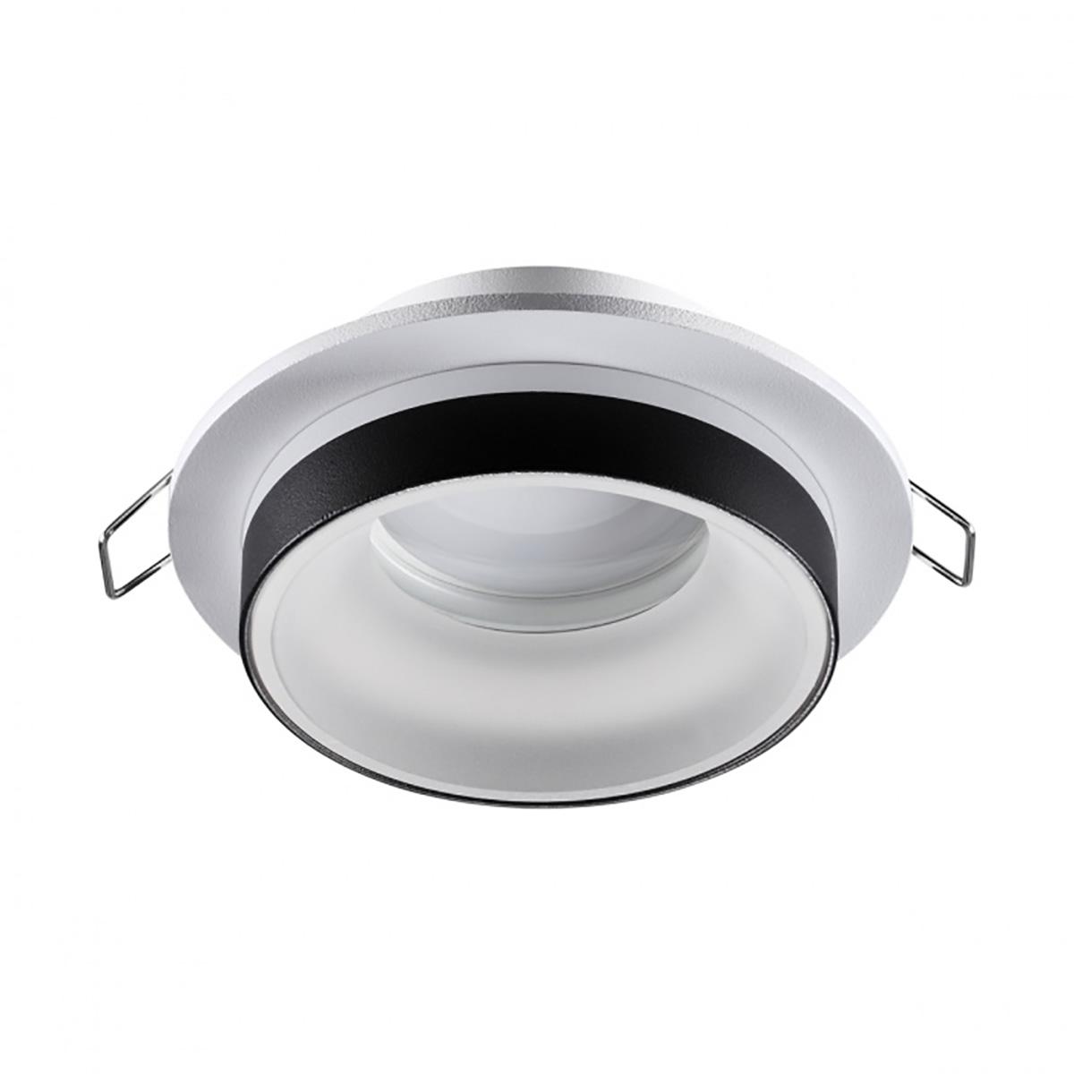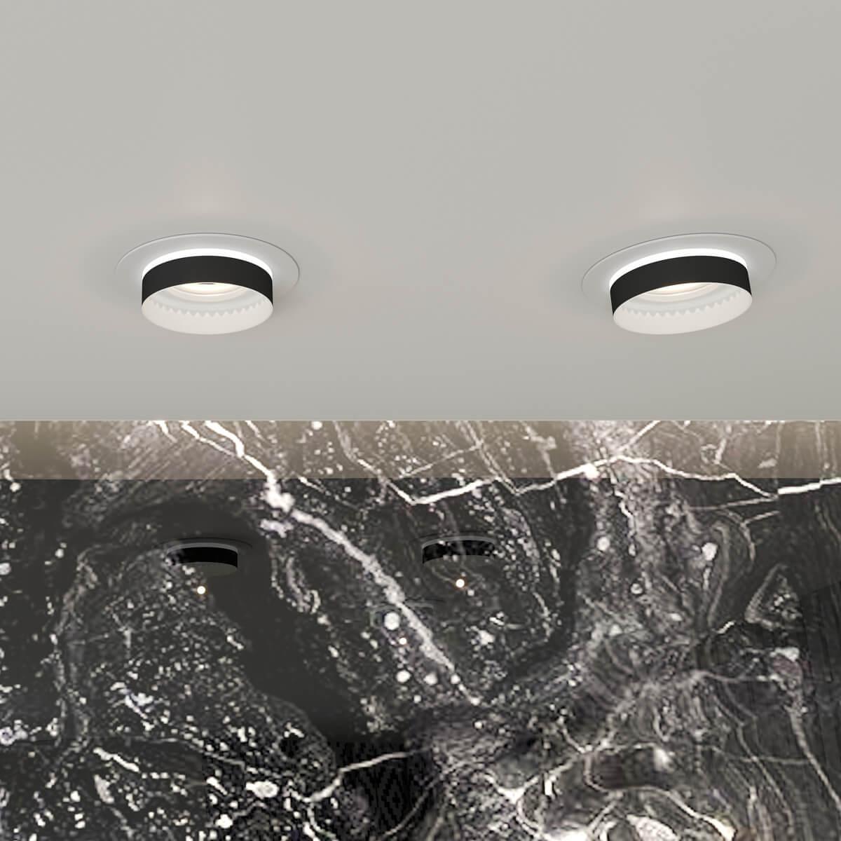 Круглый встраиваемый светильник белого цвета с черной окантовкой вокруг лампы.