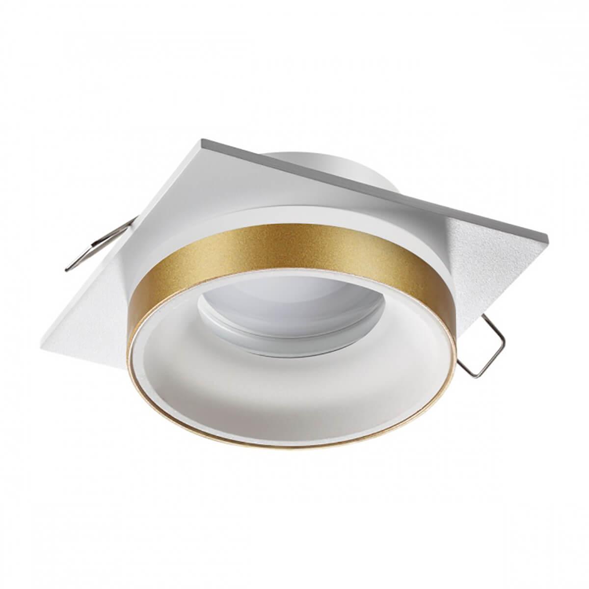 Квадратный встраиваемый светильник с арматурой белого цвета и круглым плафоном с золотой окантовкой вокруг лампы.