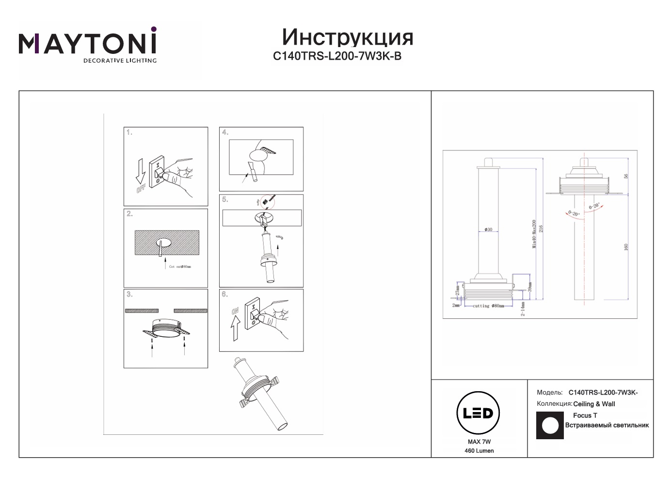 Встраиваемый светодиодный светильник Maytoni Focus T C140TRS-L200-7W3K-B — это модель, которая воплощает гармонию формы и функции. Благодаря источнику света с типом цоколя LED и мощностью 7 Вт, а также цветовой температуре 3000 К, этот осветительный прибор обеспечивает комфортное и равномерное освещение на площади в 1 квадратный метр, создавая уютную атмосферу в вашем доме. Световой поток равен 460 Лм.